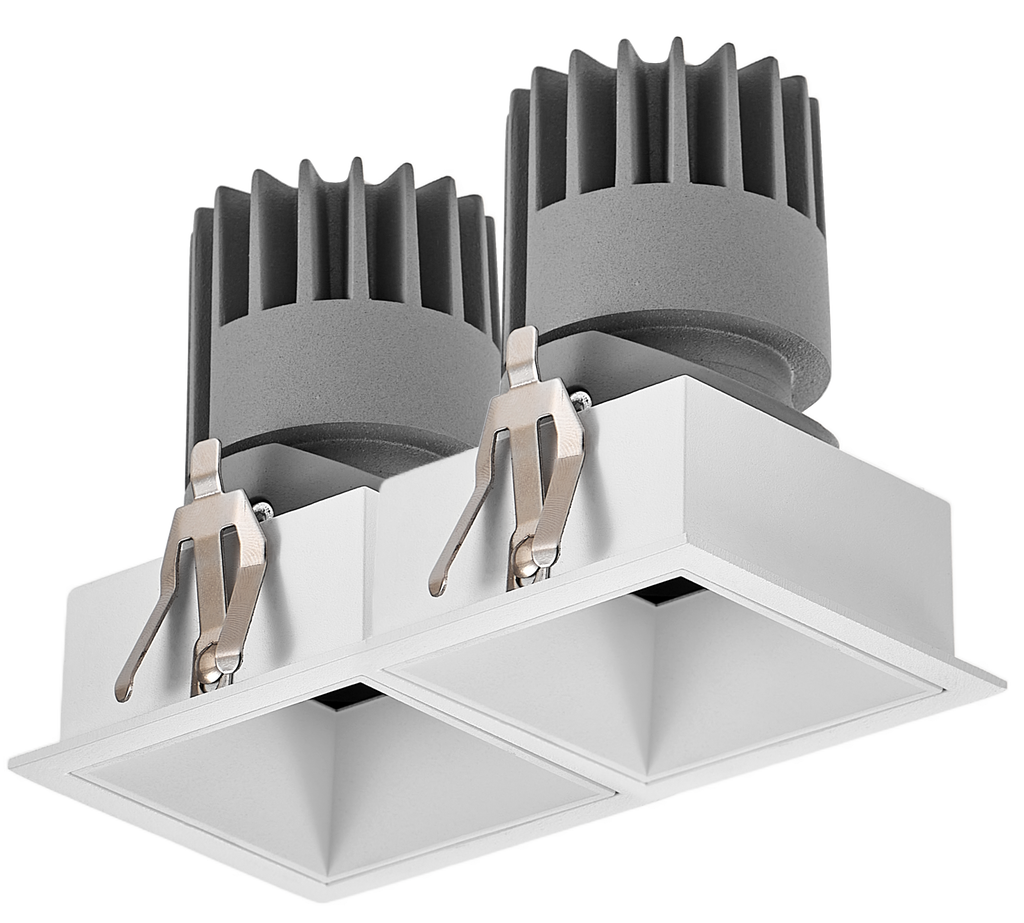 | Recessed Adjustable Downlight (2 Heads) features two 6W LED lights, emitting warm white light at 3000K with a 36° beam angle for focused illumination. Designed for recessed installation, it measures 120mm diameter x 92mm height with a cut-out size of 111mm x 58mm. Rated IP20, this fixture is ideal for indoor use, offering adjustable dual heads for versatile and precise lighting direction. |