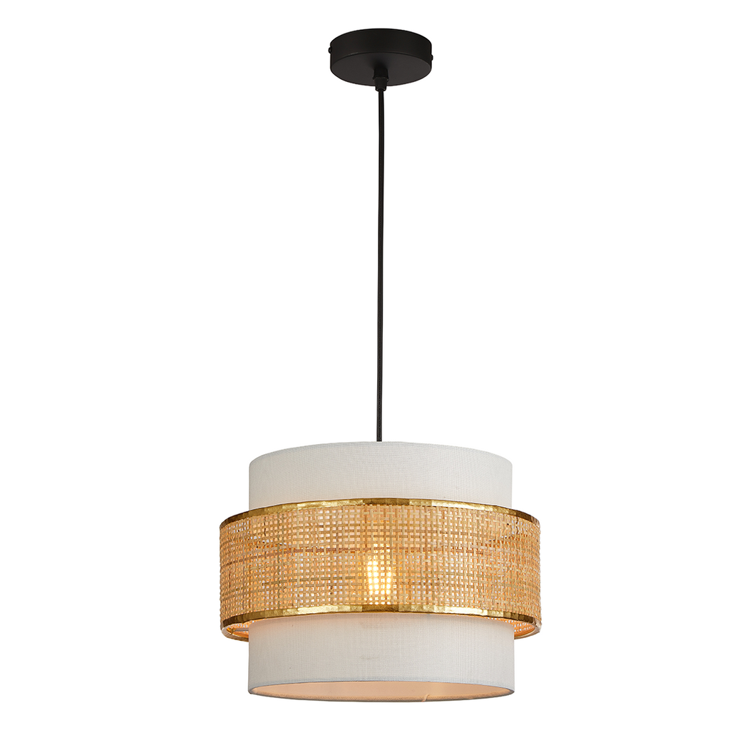 A pendant lamp constructed from fabric and metal offers a stylish and functional lighting solution for various interior settings, combining aesthetic appeal with practicality and ease of maintenance.